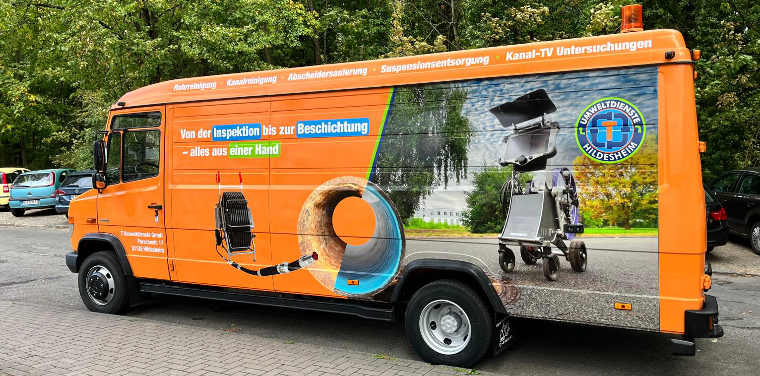 Mit Stolz präsentieren wir unser neu ausgestattetes Spezialfahrzeug für Kanaluntersuchungen – ein echtes Highlight im Fuhrpark der T Umweltdienste GmbH. Es vereint modernste Technik mit einem frischen, aufmerksamkeitsstarken Design, das nicht nur funktional überzeugt, sondern auch optisch ein klares Statement setzt.